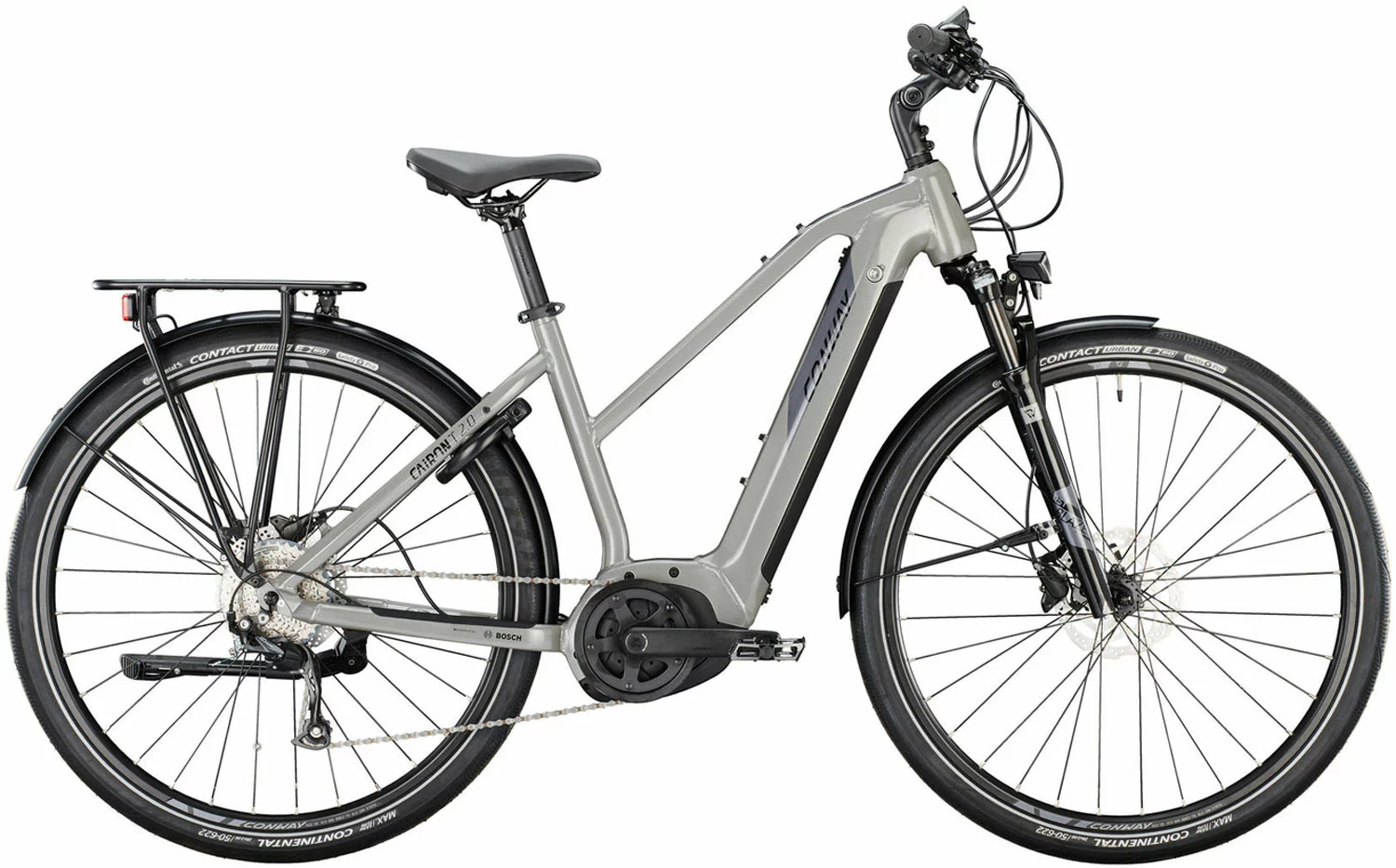 Beim Conway Cairon T 2.0 Lady ist der Name Programm, denn das T steht für Trekking und Tour. Der Bosch Gen. 3 Performance Motor sorgt für Unterstützung auf langen Touren und der 500 Wh starke Akku liefert das nötige Durchhaltevermögen. Die Federgabel sorgt jederzeit für eine Extraportion Komfort.