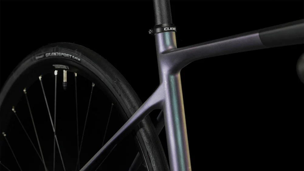 In CUBE’s Twin Mold Monocoque Verfahren hergestellt, präsentiert sich der Axial WS GTC Rahmen als absolutes Meisterwerk im puncto cleane Carbonkonstruktion. Seine hohe Steifigkeit verdankt er den Oversized-Rohren des Hauptrahmens, die nicht nur die Lenkpräzision, sondern auch die Kraftübertragung von der Fahrerin aufs Hinterrad optimieren. Seine schlanken Sitzstreben arbeiten perfekt mit der Carbongabel zusammen – gemeinsam federn sie sämtliche Unebenheiten auf der Straße souverän ab. Ihrem Namen alle Ehre macht die Road Comfort Geometry, denn sie ermöglicht Racerinnen eine erstklassige, komfortable Sitzposition auf dem Bike – besonders wertvoll auf langen Distanzen. Das Ergebnis ist ein leichtes, präzises, bequemes – und pfeilschnelles – Chassis!