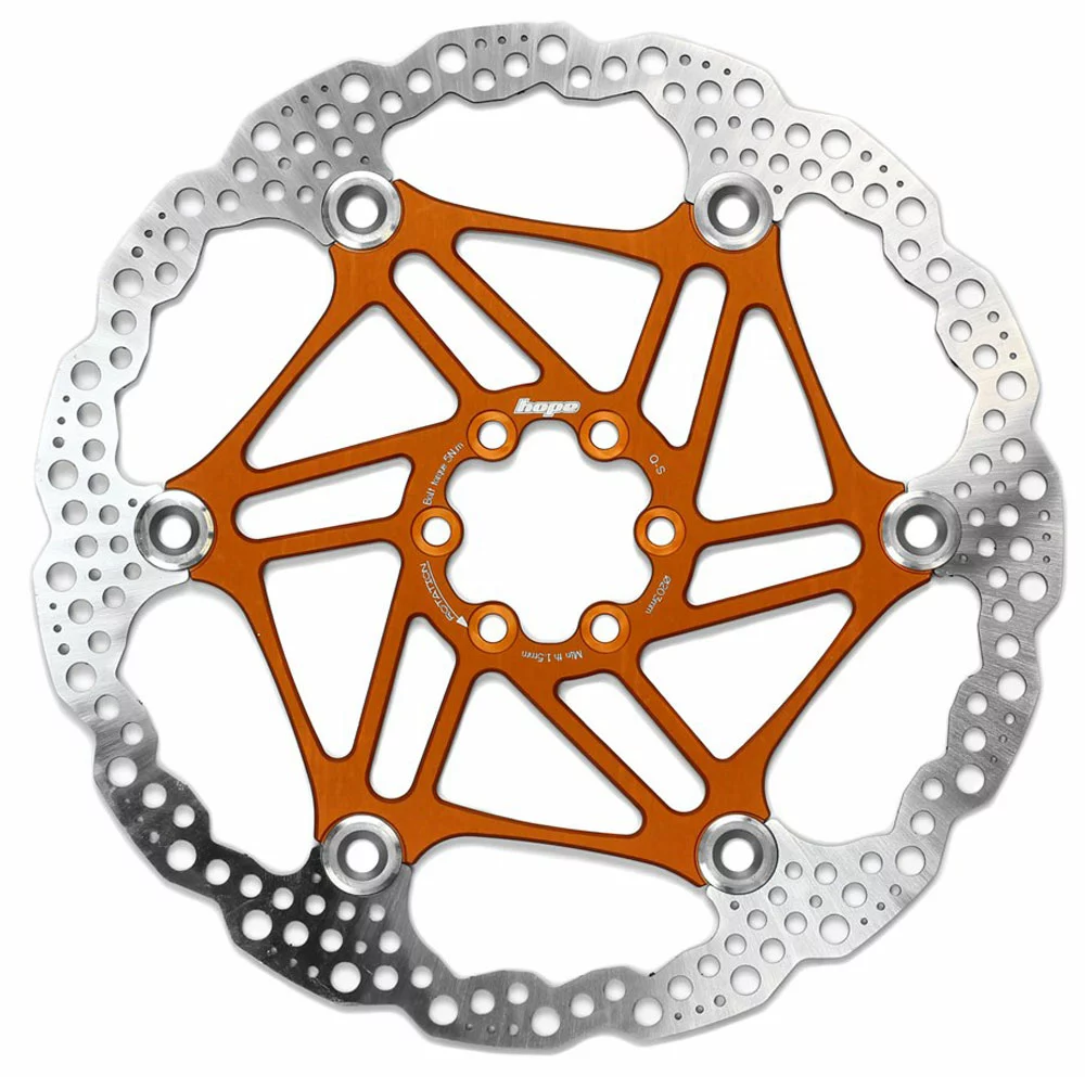 Hope’s Floating 6-Loch Scheibenbremsen sind unter Mountainbiker beliebt, da sie die Leistung optimieren und einfach auffallend sind. Die Bremsfläche aus Edelstahl wird zum Aluträger genietet. Diese Konstruktion spart Gewicht und die Scheibe darf sich bei Wärme ausdehnen und zusammenziehen, ohne verformt zu werden.