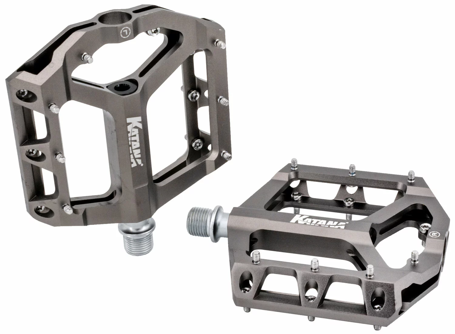 Die Fire Blade Plattformpedale von Katana verfügen über einen sehr leichten Aluminium-Korpus und extralange Pins für optimalen Grip. Dank der hochwertigen Industrielager, der matten Oberläche und der verwendeten Materialien sind diese flachen MTB-Pedale auf geringes Gewicht, eine lange Lebensdauer und größtmögliche Vielseitigkeit ausgerichtet. So sind sie nicht nur für alle Situationen vom anspruchsvollen Trail bis zur täglichen Pendelstrecke geeignet, sondern machen sich auch am Trekkingrad oder E-Bike gut!