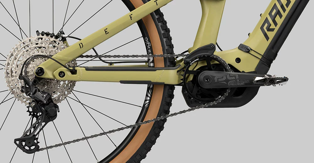 Die Zugführung ist ultraclean, alle Züge gehen vorne direkt durch den Acros ICR Steuersatz in den Rahmen, von dort aus verlaufen sie sauber und geschützt im Rahmen. Der Steuersatz beherbergt auch den Block Lock Anschlagschutz, sodass Du im Falle eines Sturzes nicht den Rahmen beschädigst. Der Speedsensor sitzt geschützt im linken Ausfallende und bekommt das Signal vom Magneten, der sich mit der hinteren Bremsscheibe dreht. Für die Zukunft gibt es im Oberrohr eine Vertiefung, um ein cleanes Mini-Display aufzunehmen. Perfekt passend zum Vollgas-Chassis aus Carbon ist der durchzugsstarke Bosch Performance CX Motor der neuesten Generation mit seinen 85Nm und seinem 750WH Akku, der Dir epische Touren ermöglicht. So lange konntest Du bisher noch nie shredden, der Aktionsradius verschiebt sich deutlich. Und nicht zuletzt geben wir allen DEFT -Modellen eine supersolide Ausstattung mit, die zur DNA des Bikes passt, damit es Dir auf dem Trail an nichts fehlt. Es wird deftig mit unserem DEFT!