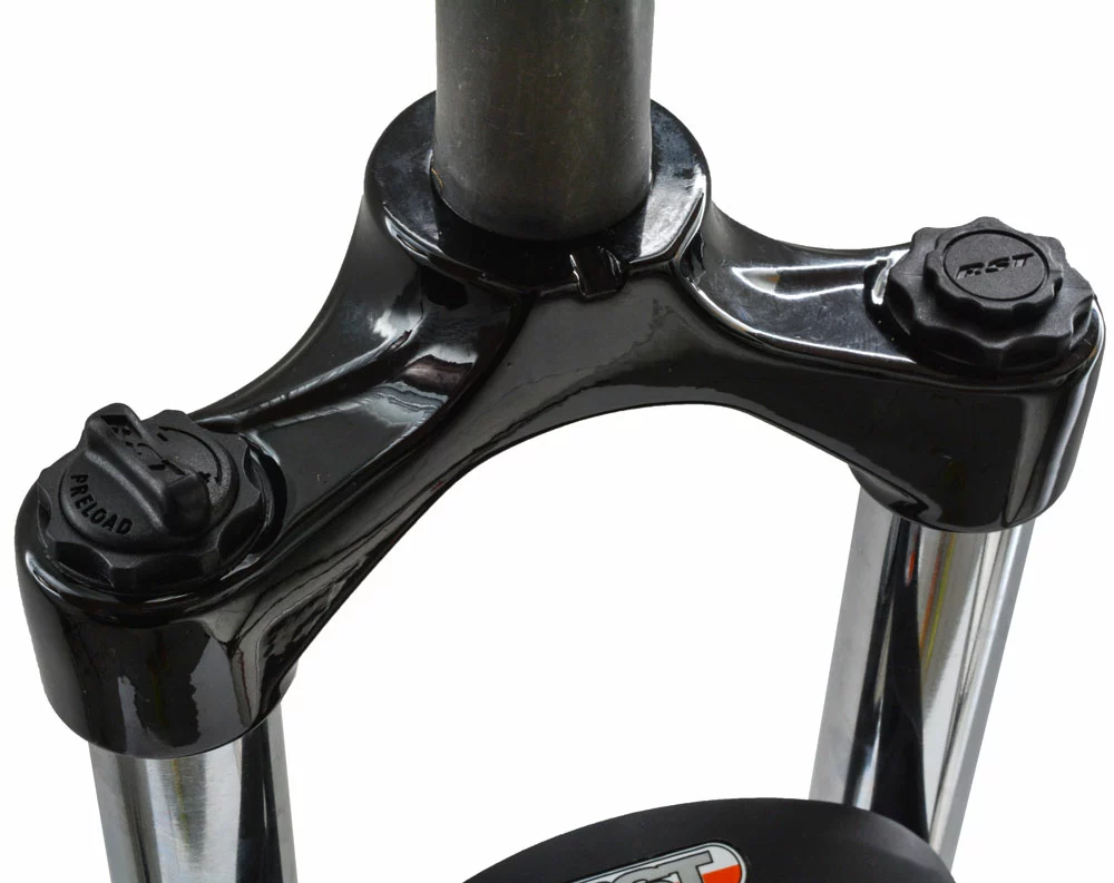 Die RST Gila T mit einem Federweg von 100 mm ist eine ideale Federgabel für Cross Country Einsteiger, durch die verstellbare Federvorspannung ist ein individuelles Setup möglich. Die Gabel ist sowohl mit einer Postmount-Disc, als auch mit einer Felgenbremsaufnahme (V-Brake) ausgestattet. Dank der geschraubten Kabelführung lässt sich der Bremszug mühelos verlegen.