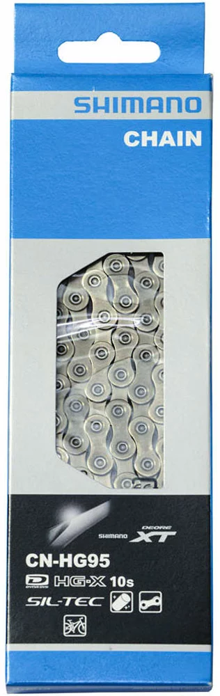 Die laufrichtungsgebundene superschmale Shimano XT CN-HG95 10-fach HG-X-Kette speziell für MTB und Trekking mit schmutzabweisendem Design. Diese Kette schaltet flüssiger, spart Gewicht und erhöht insgesamt die Systemleistung.