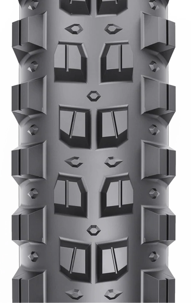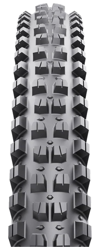 Drei verschiedene Gummimischungen bieten ein optimales Maß an Traktion, Unterstützung und Haltbarkeit. Eine Basis aus Gummi mit hoher Durometerhärte stützt die gesamte Lauffläche und geht in die Noppen über, um Falten oder Verformungen zu vermeiden. Mittelnoppen mittlerer Steifigkeit überdecken die Basisschicht und sorgen für Traktion und Haltbarkeit, ohne die Abrolleffizienz zu beeinträchtigen, während die Seitennoppen aus weicher Gummimischung für maximalen Grip und langsamen Rebound sorgen, was die Traktion in Kurven erhöht.