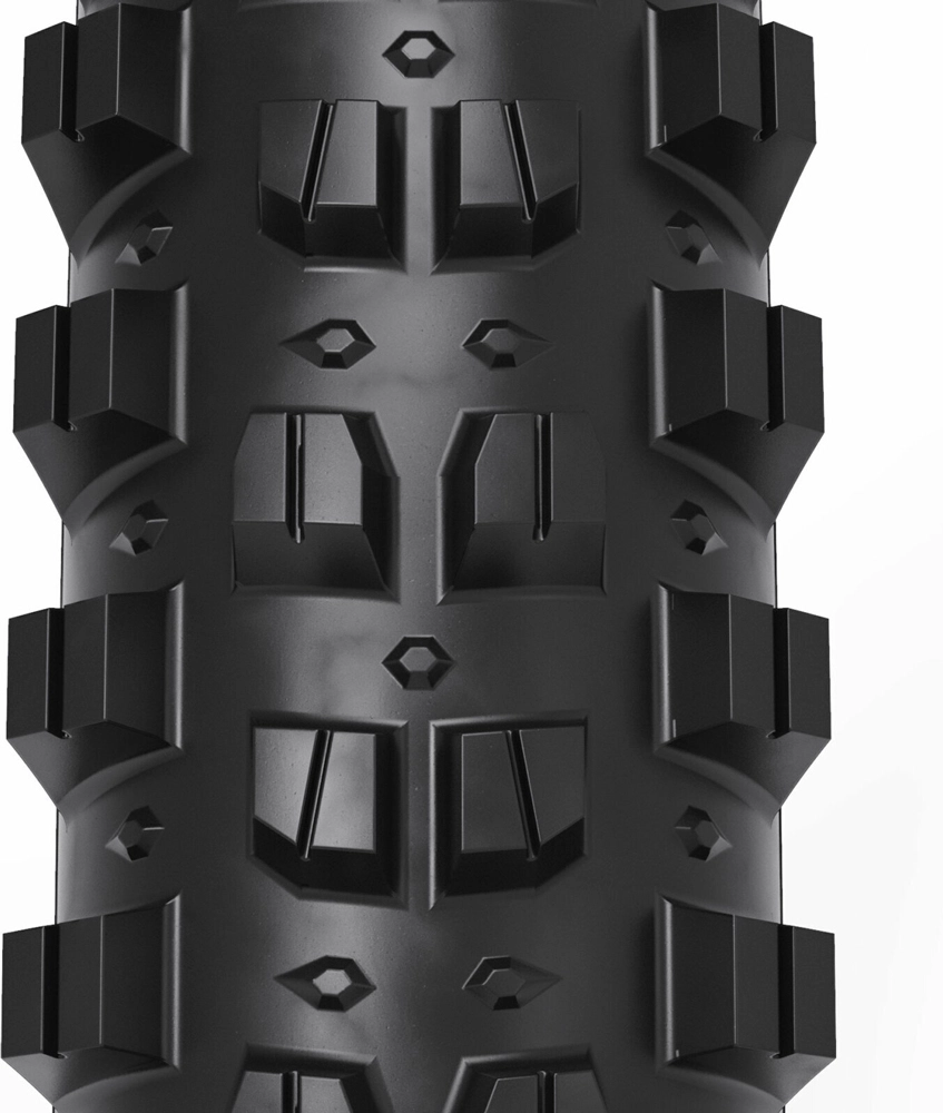 Drei verschiedene Gummimischungen bieten ein optimales Maß an Traktion, Unterstützung und Haltbarkeit. Eine Basis aus Gummi mit hoher Durometerhärte stützt die gesamte Lauffläche und geht in die Noppen über, um Falten oder Verformungen zu vermeiden. Mittelnoppen mittlerer Steifigkeit überdecken die Basisschicht und sorgen für Traktion und Haltbarkeit, ohne die Abrolleffizienz zu beeinträchtigen, während die Seitennoppen aus weicher Gummimischung für maximalen Grip und langsamen Rebound sorgen, was die Traktion in Kurven erhöht.